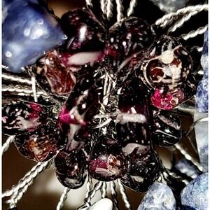Beautiful Handmade Blue Sodalite chips wire wrapped around Silvertone adjustable size bracelet. Has Purple Fluorite stones in center of bracelet. Some wired stones are moveable and able to be laid flat or stood up.