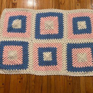 Selling a Beautiful Handmade Crochet Pink, Blue, and White Lap Blanket. It measures 3' (l) x 4' (w), it has pink and blue square designs, and little pink and blue ball accents in the center of the squares. Very beautifully made!
