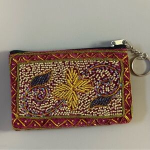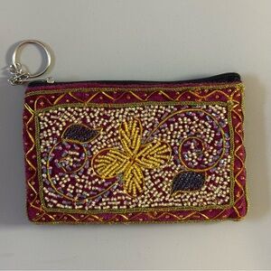 Chic and stylish, this embroidered coin purse features a vibrant pink and gold design. Perfect for keeping your essentials organized. This is a handmade item with beautiful floral beaded design on velvet fabric.