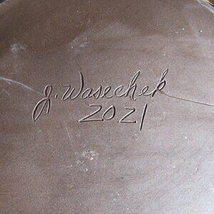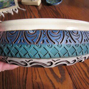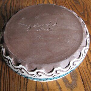 Handmade, this beautiful bowl measures 9.5" diameter x 2" tall. Signed.
