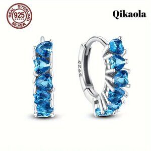 These elegant tiny silver huggie hoop earrings feature stunning heart-shaped blue zircon stones, adding a touch of sparkle and color.