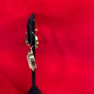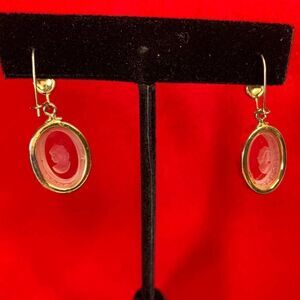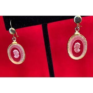 Earrings hold the cameo in a gold band dangling below an artistically made pierced loop