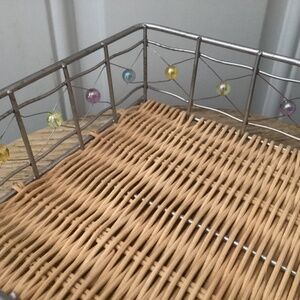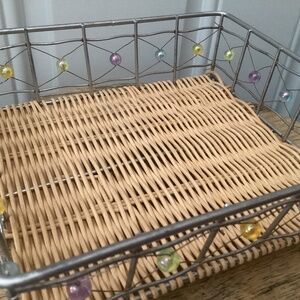 This is a beautiful basket I have had for years and I am finally getting rid of it! I never used it. The bottom of the basket is very sturdy. I am not certain what it is made from. You could store items in this (makeup, fingernail polish, pens, jewelry, medicine, washcloths, etc) or you could just display as a decorative piece. This is really beautiful. It measures approximately 3”x7”x8”. It is made with different color iridescent beads. Could be used for storage or just as a decorative piece.