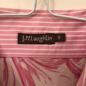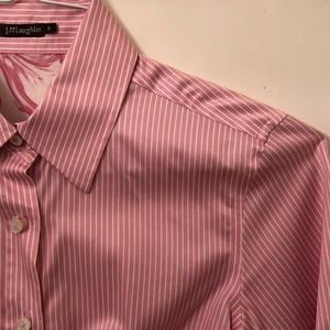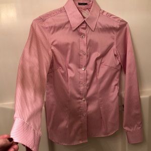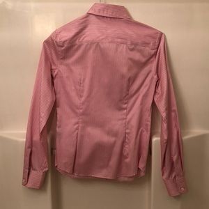 Beautiful top that retails for $168. Excellent condition except for two tiny spots pictured here that are hardly noticeable and could easily be dry cleaned out for a couple dollars. 100% silk work professional couture. love this pink pin striped gem! selling at a steal!