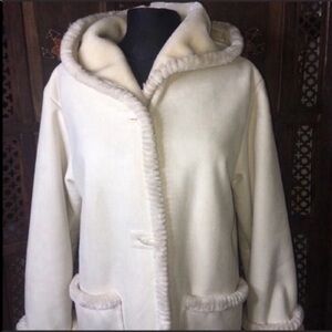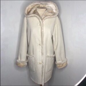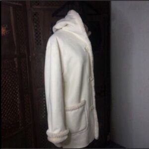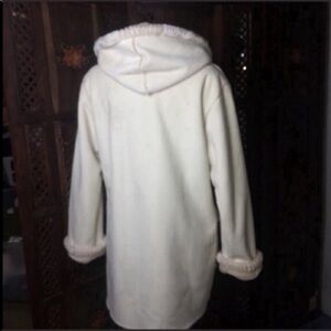 Beautiful hooded pea coat with 3 toggle buttons on front two large pockets on front inside has shearling like napping for softness and warmth size small 100% polyester outer and Polyester acrylic inside