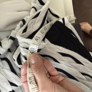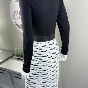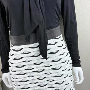 🌹This is a show stopper! Beautiful black top with built in scarf, black and white bottom with ribbon look. Super classy! 19 inches pit to pit. 41 inches shoulder to hem. A little wear from washing but nothing too noticeable. 🌹
