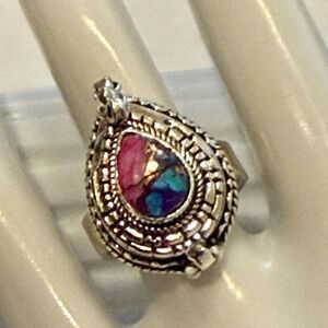 Embrace the vibrant spirit of the Southwest with our Beautiful Kingman Pink Dahlia Turquoise Poison Ring. This exquisite piece features a stunning Kingman Pink Dahlia Turquoise stone, known for its unique pink hues and intricate patterns. Set in high-quality 925 sterling silver, this ring is a true statement piece that combines traditional craftsmanship with contemporary style.