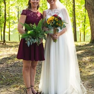 I bought this Morilee by Madeline Gardner ivory dress brand new from Wendy’s Bridal in 2019. I fell in love with this dress as soon as I put it on. I had an outdoor fall rustic wedding and this dress was the perfect fit. A lot of wedding dressing can be really heavy but this dress was so light and it’s extremely comfortable. It has beautiful lace and beading on the top then flows perfectly at the waist. It’s very forgiving and flattering around the waist.