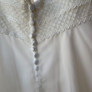 Condition: It has no stains, no rips, and it’s still able to be bustled. Two of the button loops on the back are ripped (buttons 5 & 7, see photo). I still have the original two extra buttons along with some beading and lace that came with purchase of the dress. The zipper is in great shape and all other buttons and straps are intact.