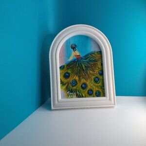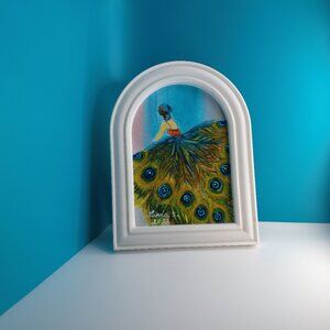 Beautiful Lady in Peacock Dress 5"x7" within a new arch shape white Frame