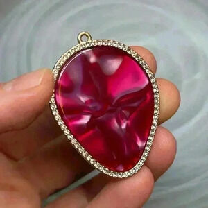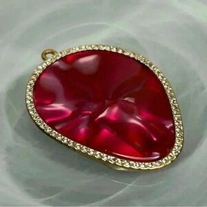 Beautiful Large Hot Pink Marbled Resin Surrounded by Crystals Gold Tone Pendant