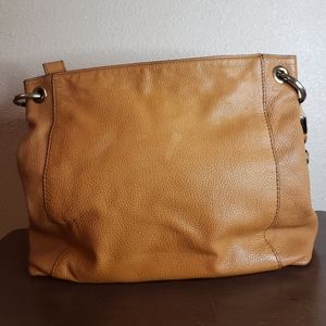 Gently used leather hobo with woven shoulder straps and two side zippers view photo for details