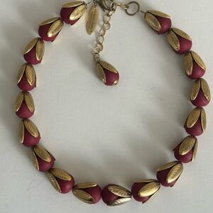 A beautiful red sienna colored lucite beaded necklace by designer Lenora Dame. It is made in the USA. This stunning necklace measures 20 inches with the extender, but can be shortened to 17 inches. It has a tulip style design with gold etched leaves on the beads. It is in great condition!