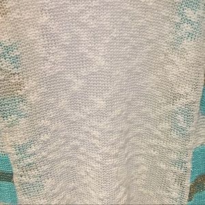 Beautiful Long Cardigan, Beige and Gold & Aqua Accents - worn only once - Mint Condition! Cute with jeans or with for work with pants or dress.