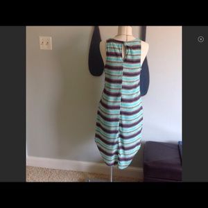 Excellent preloved condition, no stains or holes. Beautiful green with shades of mocha and chocolate,fully lined with keyhole back. 41" back to hem and approx 29" front to hem. Polyester
