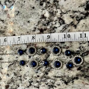 This is a lovely blue and silver tone necklace for a special occasion. I wore it at my son’s formal wedding and received many compliments. The zinc cable chain is 17 inches long with a 2 inch extender. This necklace is in like new condition, only worn once.