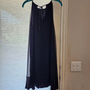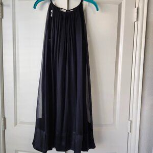 This black silk flowy dress has open shoulders with V cutout in the back and tie on nect.