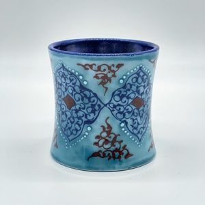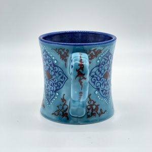 This stunning coffee cup features gorgeous glazing and hand painting. Some elements are raised.