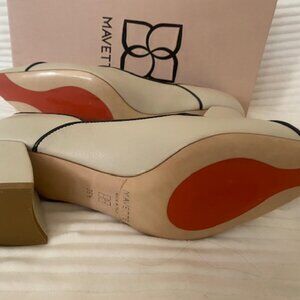 These ivory calf skin Fiona loafers from Mavette are so hard for me to let go! They're a size 9.5 but fit like a glove -- it's just a bit too snug on my toes to wear them. If you're a bit narrower at 9.5 or if you're a size 9, these will be perfect for you. They have not been worn. They're a cream color with brown piping. They are the softest shoes I've even touched and you look instantly elegant when you put them on. The heel is 1.5" to 2". They're incredibly comfortable. They come in the original box with the original packing and they have dust covers for each shoe.