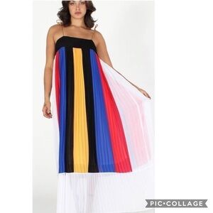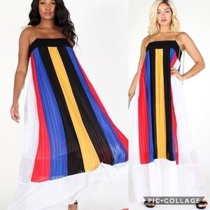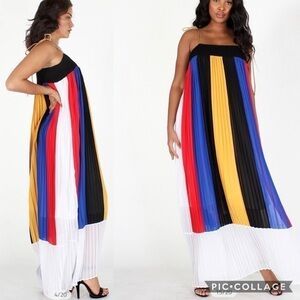 Beautiful! Maxi Multi-Color Dress. Dress has ripples of flowing colors. Dress is fully lined & is strapless. Has multi-color cord like ties.