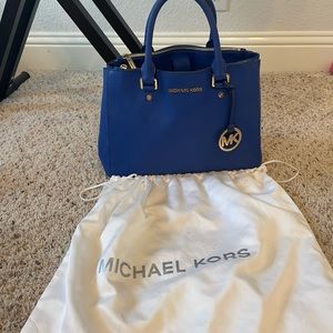 Beautiful Michael Kors bag in stunning cobalt blue - pre-loved bag in Good condition. Please refer to pictures for signs of wear. Leather has been cleaned and overall looks great(!), but does have signs of wear near bottom and bottom-sides of bag, inside of bag has stains from use. structure of bag is still in very good condition - handles and zippers are in great condition. "original dust bag included"