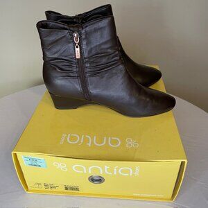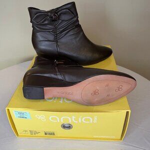These are gorgeous Antia Cindy mocha leather ankle boots. They have a cute bow detail and ruching all around the boot. They zip on the inside. Worn once. Great condition, like new.