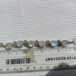 So pretty! Artisan -designed Moonstone bracelet in 925 silver. Fits 5-6.5'' depending on where you toggle it. 6.5'' long. Cost £140 / $190 accept $115 Slim enough to make for a dramatic stacking bracelet Boho -style but delicate alone for uber-femme style