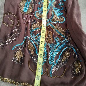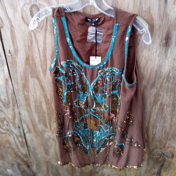 Mocha brown top with sequence in front. Measurements r in pictures. Item is New with tags !