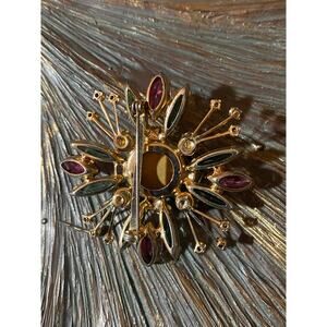 This is a beautiful Brooch featuring multi-colored rhinestones. The rhinestones catch the light beautifully, creating a dazzling effect.