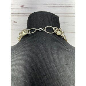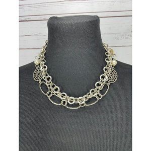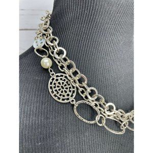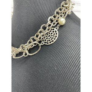 Beautiful Multi Layered Silver Metal Chain Round Pearl Button Necklace