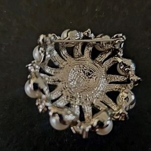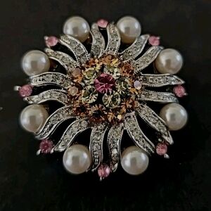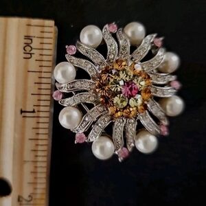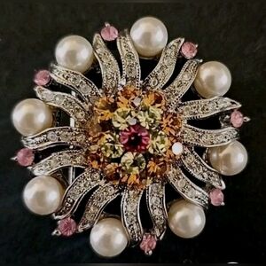 Beautiful multi-colored rhinestone costume jewelry brooch with faux pearls! The brooch is 1.5" round and has pink and dark yellow rhinestones. All stones are intact.