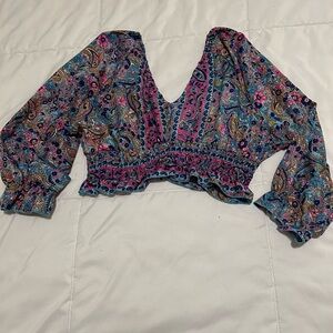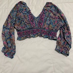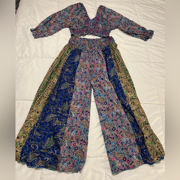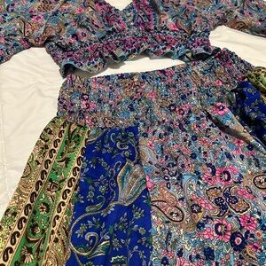 Embrace vibrant style with these floral multicolor wide-leg pants and matching crop top. Perfect for any occasion, this set offers a comfortable fit and a bold look. Beautiful silk fabric with a lot of stretch where it’s smocked. One size fits most.