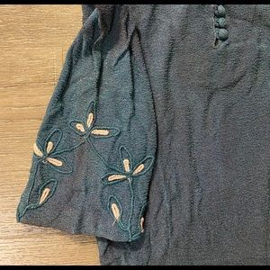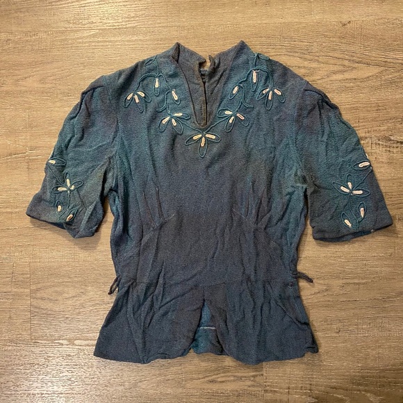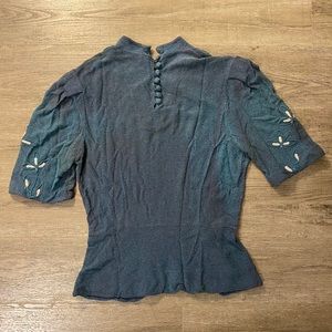 This beautiful peplum style blouse has lovely fabric buttons and a flirty floral detailing on the sleeves and neckline.