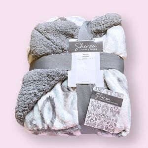 Beautiful NEW Sherpa Blanket Throw Brush Stroke Geometric Pattern White Grey Light Blue