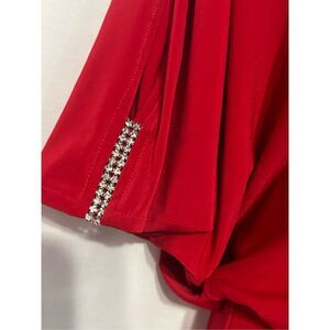 NEW WITH TAGS 1990s Cache Red Satin Batwing Cutout Draped Dress USA Made / Women’s Small Features: * Scoop neck. * Jewels on wrist and shoulders. * Batwing with cutouts. * Hiphugger skirt. * Draped dress.