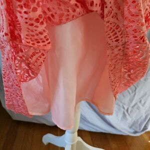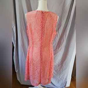 Beautiful ladies NY&C Eva Mendes size 16. sleeveless dress. zipper and eye hook back. light pink. lace overlay with light pink liner. excellent condition 39 inches from shoulder to bottom and 20 inches across pit to pit.