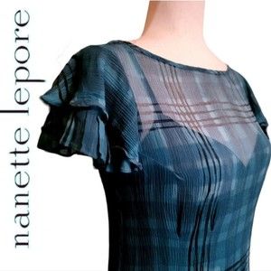 Look fashionable and chic wearing this beautiful 2-piece silk plaid dress from Nanette Lapore! The dress features a pleated skirt, boat neckline, and romantic sweet flutter cap sleeves in the sheer turqouise and blue hue plaid pattern with solid black under slip.