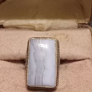 This Beautiful Natural Blue Agate in sterling silver setting is 2 inches tall. ring size 7ish. very pretty the pictures do it no justice.