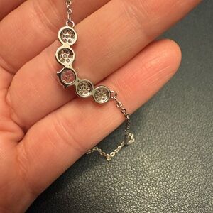 Brand new, never worn, beautiful silver plated necklace with 2 clear stones on each side of the middle pink stone. Nickel free. 16” with 2” extender.