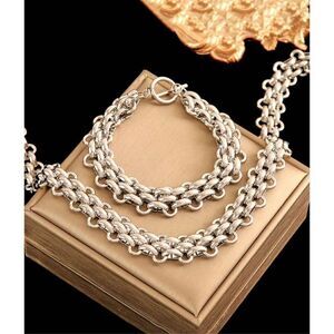 Stunning Necklace and bracelet set both done in a silver fancy chain link and toggle closures. Beautiful stainless steel that won’t tarnish and that will keep its color. NWT. Bracelet approx 7.5 inches and necklace 17 inches. These will easily dress up any outfit.