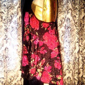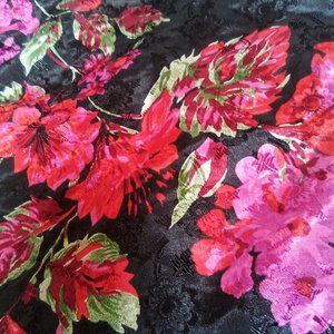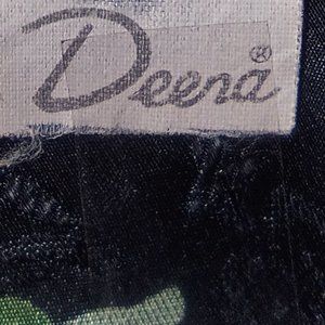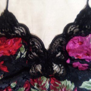 This vintage negligee is made by Deera, the colors are so vibrant and shimmering the pictures do not do it justice. Multi colored floral design on a black backdrop make this exquisite sized at a Medium seems a little larger but I could be wrong. Has beautiful lace on the bust, real thin lace at the edge of the hem line and thin spaghetti straps make this so feminine and sexy. Measurements are bust 36 inches and the length is 25 inches. Made from 100% Polyester it says machine washable in warm water on gentle but I would hand wash it being vintage and line dry.