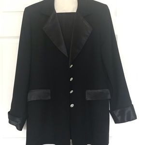 While I’ve listed this jacket as evening the right person could definitely pull this off for day and office wear. This Oleg Cassini jacket is a flattering fingertip length. Made of 100% wool it is fully lined in a 63% acetate & 37% rayon silky material that doesn’t interfere with the drape of the jacket. The collar, cuffs and pocket flaps are a contrast in black satin and the 4 buttons are festooned with rhinestones to complete look. Ladies size 10 in a generous and appealing cut.