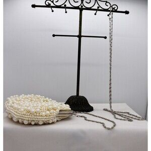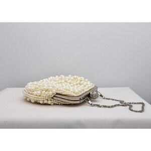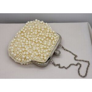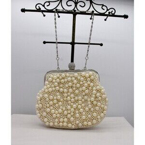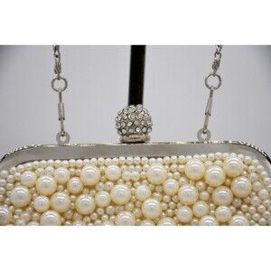 Beautiful Pearl Studded Gem Purse with Silk fabric lining. Silver chain for hand purse or extended chain for shoulder purse. Measures 7 L x 6 H inches