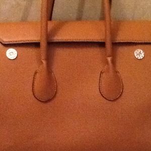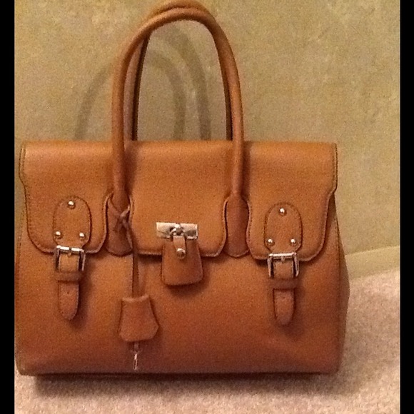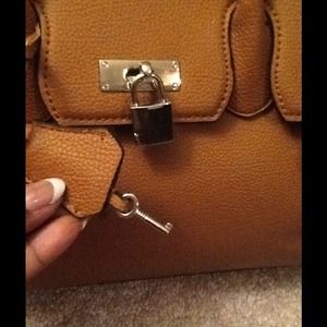 Large camel colored with silver hardware. Key and lock are functional. Easy open clasps on the back for quick access.