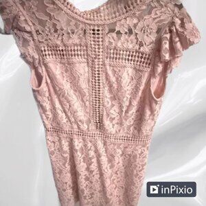NEW never worn. Size small. This elegant lace dress features a delicate pink hue, perfect for any special occasion. The intricate lace design adds a touch of sophistication and charm.