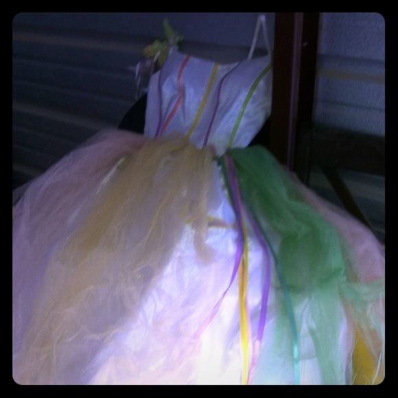 White yellow pink green poofy lace prom dress. Top is ribbon striped colors with straps made of butterflies & the bottom of the dress has. Butterfly's on it there Is ribbons that hang down also