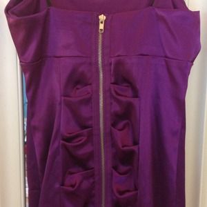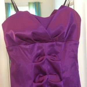 Strapless plum purple dress with detailed ruched pattern down front and back.