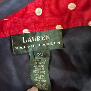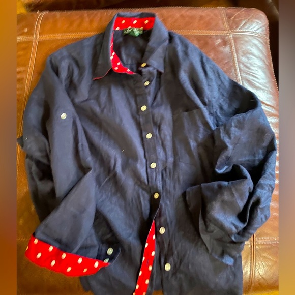 Gorgeous vintage & fun Ralph Lauren linen baby blue button town shirt . You can roll sleeves up with the button tab , leave them long or roll the cuff up to expose the adorable red w/ polka dots. ❤️🥰