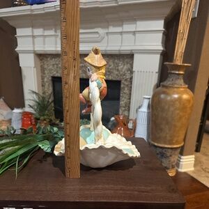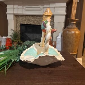 Beautiful Rare Puffed Pillowed Ruffled Cloth Ceramic Basket with Hanging Scarecrow