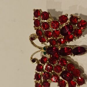 Beautiful Red Rhinestone & Goldtone Butterfly Brooch. This has tiny green rhinestone for eyes. It is bright & shiny. FYI, THE CLASP WORKS TIGHT, BUT DOES WORK. Priced accordingly.